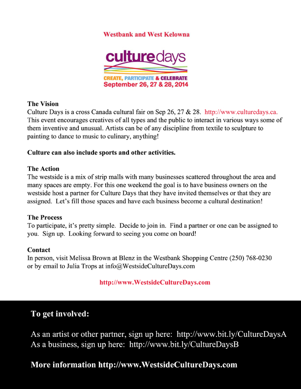 Westside Culture Days September 26 27 28, looking for Cultural partners!